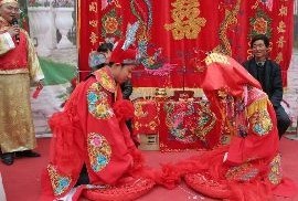 The couple goes on its knees and bows thrice- for the Heavens, the ancestors and their parents. They even bow to each other in a gesture of promising faithfulness to each other. There are no spoken vows.